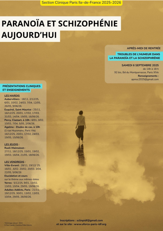 Uforca, centre de formation basé à Paris, propose une formation approfondie en psychanalyse et clinique psychiatrique contemporaine pour les professionnels de la santé mentale, dans le secteur de la santé. Cette formation, certifiée Qualiopi et éligible au CPF, est ancrée dans l'enseignement de Freud et Lacan et privilégie l'entretien clinique singulier. Le programme annuel, structuré autour d'un thème central, combine des journées d'étude mensuelles, des présentations de patients en direct, des études de cas commentées et des cours théoriques, avec des sessions s'adressant aux professionnels travaillant avec des adultes, des adolescents ou des enfants, abordant des problématiques spécifiques comme les psychoses, les addictions ou la clinique du tout-petit. Les activités se déroulent principalement à l'Hôpital de Ville-Évrard à Neuilly-sur-Marne, avec des activités annexes dans d'autres établissements hospitaliers de la région parisienne.